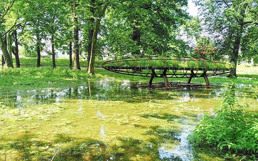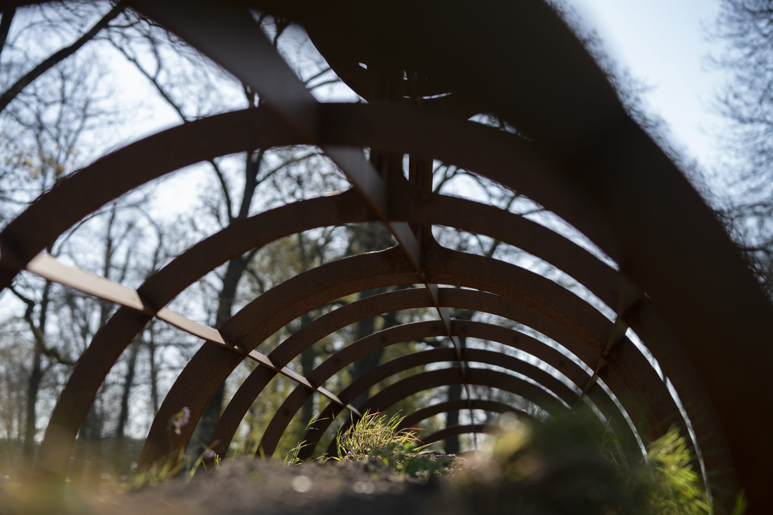 De installatie Worpscape van Rob Sweere biedt ruimte voor bezinning. Het gaat over tijd en relativiteit en over koesteren wat zomaar verloren zou kunnen gaan. Het is een van de kunstwerken die na de IJsselbiënnale een permanente plek hebben gekregen. Worpscape is te zien in het Worp plantsoen in Deventer.