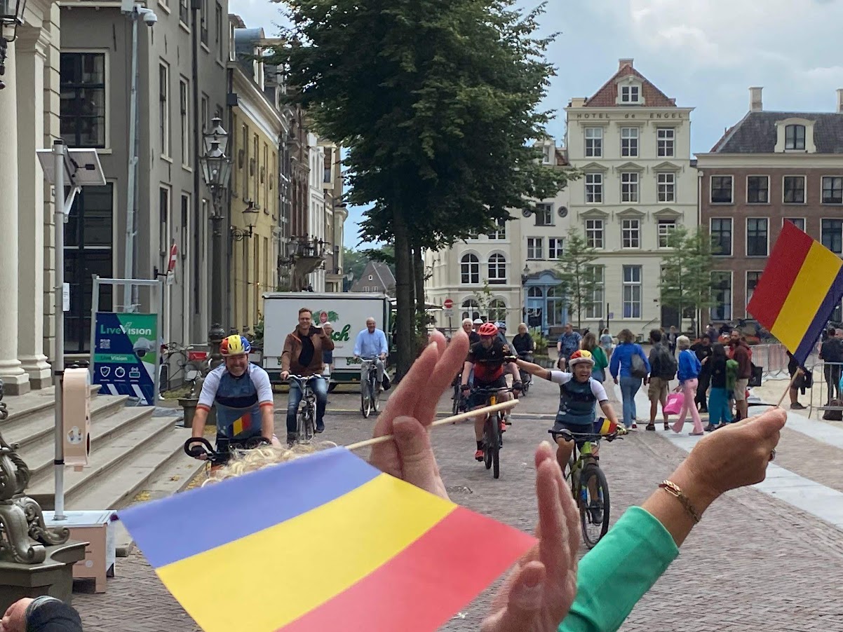 Als ze in Nederland de grens passeren, zijn ze niet alleen. Wouter: “Bij alle steden melden zich vrienden, oud-collega’s of goede relaties om mee te fietsen! Dat geldt ook voor partners binnen het uitgebreide netwerk van de Sustainable Developmant Goals in Nederland.” Adina: “Bij Mill was er zelfs champagne en vuurwerk. In Harderwijk werden we uitgenodigd om in een nieuwe geveltuin lavendel te planten als symbool van het vergroeningsproject van gemeente en bevolking.”